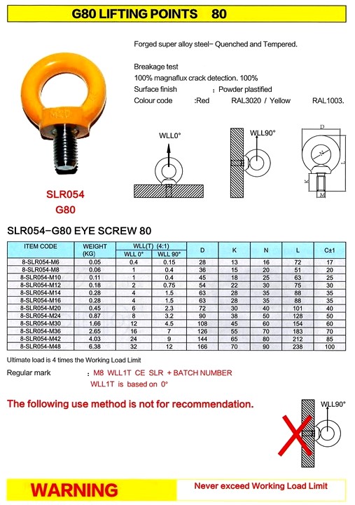 The eye bolt must be aligned during installation and tightened to secure it against rotation during lifting. For angular lifts adjust working load as shown above. M36 4 54mm 5100 kg plain 40588 ea 101 52 m42 4 5. It is not recommended that you use more than one shim to align the eye bolt with the sling leg.